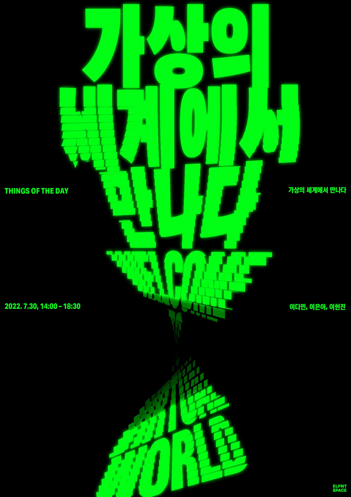엘리펀트스페이스 띵스오브더데이 첫 번째 프로그램 <가상의 세계에서 만나다>는 빠르게 변화하는 동시대 기술에 예술적, 철학적으로 접근하는 하루를 제공합니다. 코로나19 이후 몰입감 높은 상호 연결된 디지털 세상에 대한 관심이 고조되었습니다. ‘메타버스’라는 이름으로 우리에게 성큼 다가온 이 세상에 도킹하는 액세스 기술로 가상현실(Virtual Reality, VR)과 증강현실(Augmented Reality, AR)이 주로 언급됩니다. 지금 우리는 마음만 먹으면 현실을 차단하거나 중첩하는 방식으로 가상의 경험에 동참할 수 있습니다. 지금 우리는 현실을 물리적인 것과 가상적인 것으로 구분하여 표현합니다. 이러한 이중적 경험은 우리가 소통하고 관계맺음 하는 방식부터 무언가를 창작하고 공유하는 방식, 그리고 세계를 감각하고 인지하는 체계를 재정립하는 링크로 기능합니다.