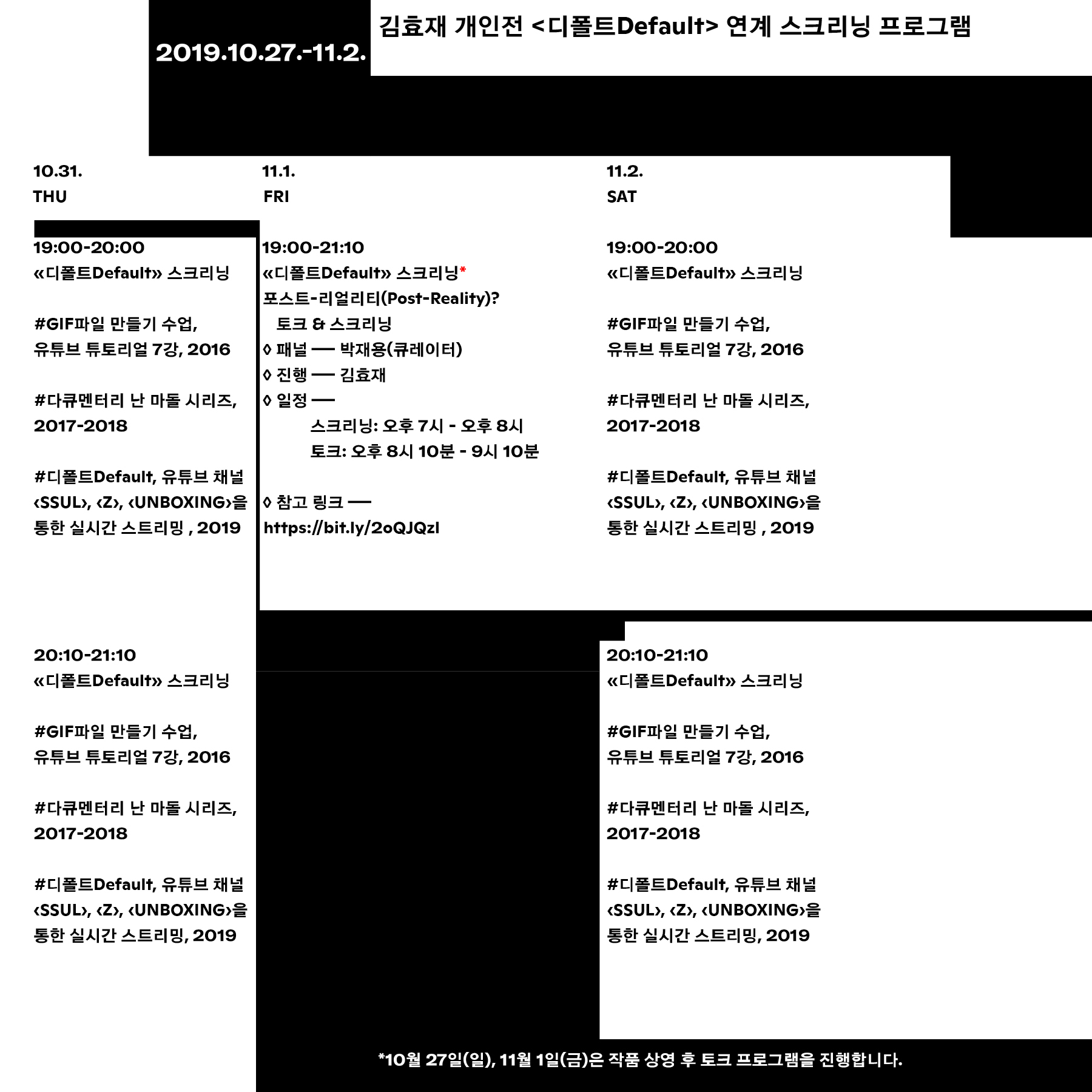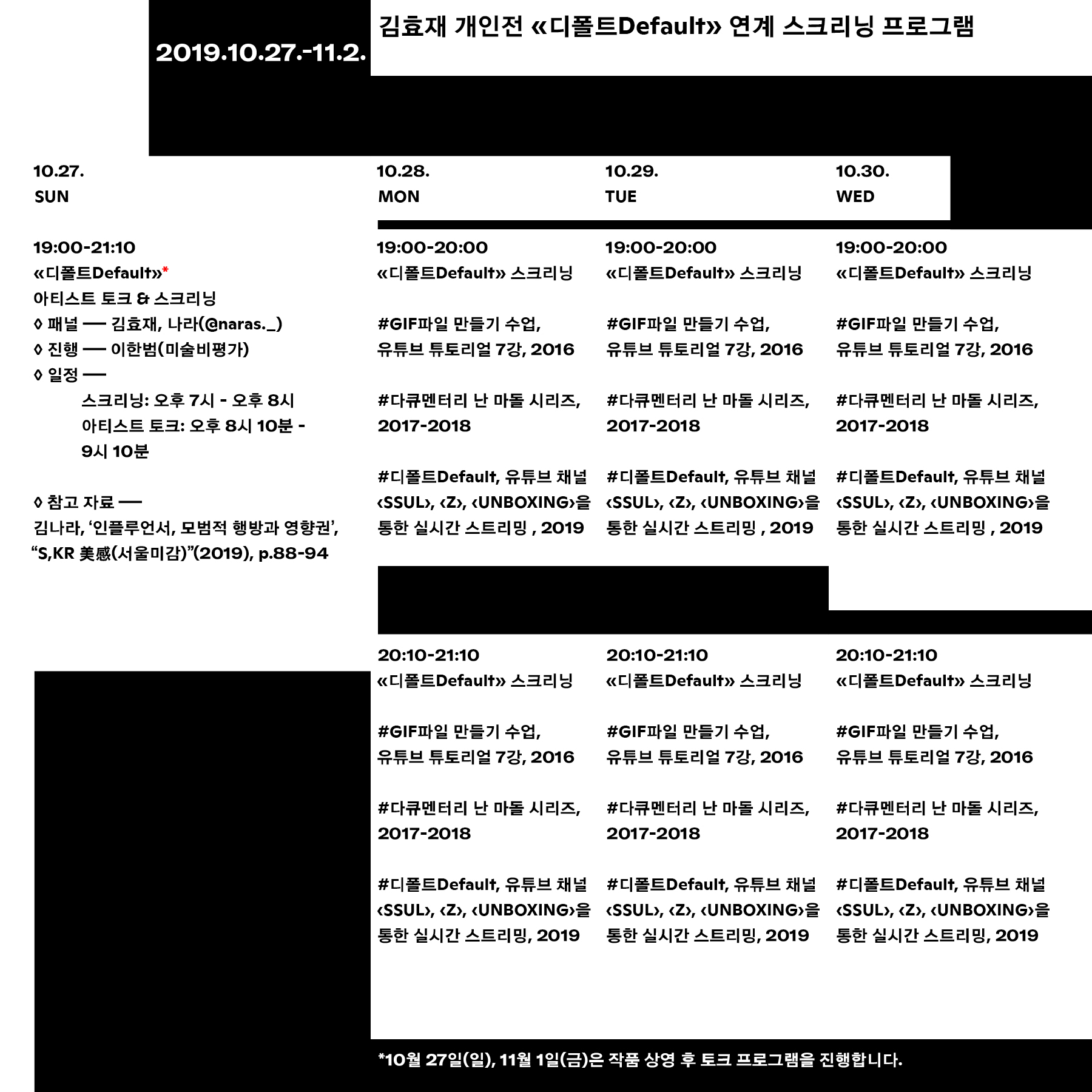 *10월 27일(일), 11월 1일(금)은 작품 상영 후 토크 프로그램을 진행합니다.