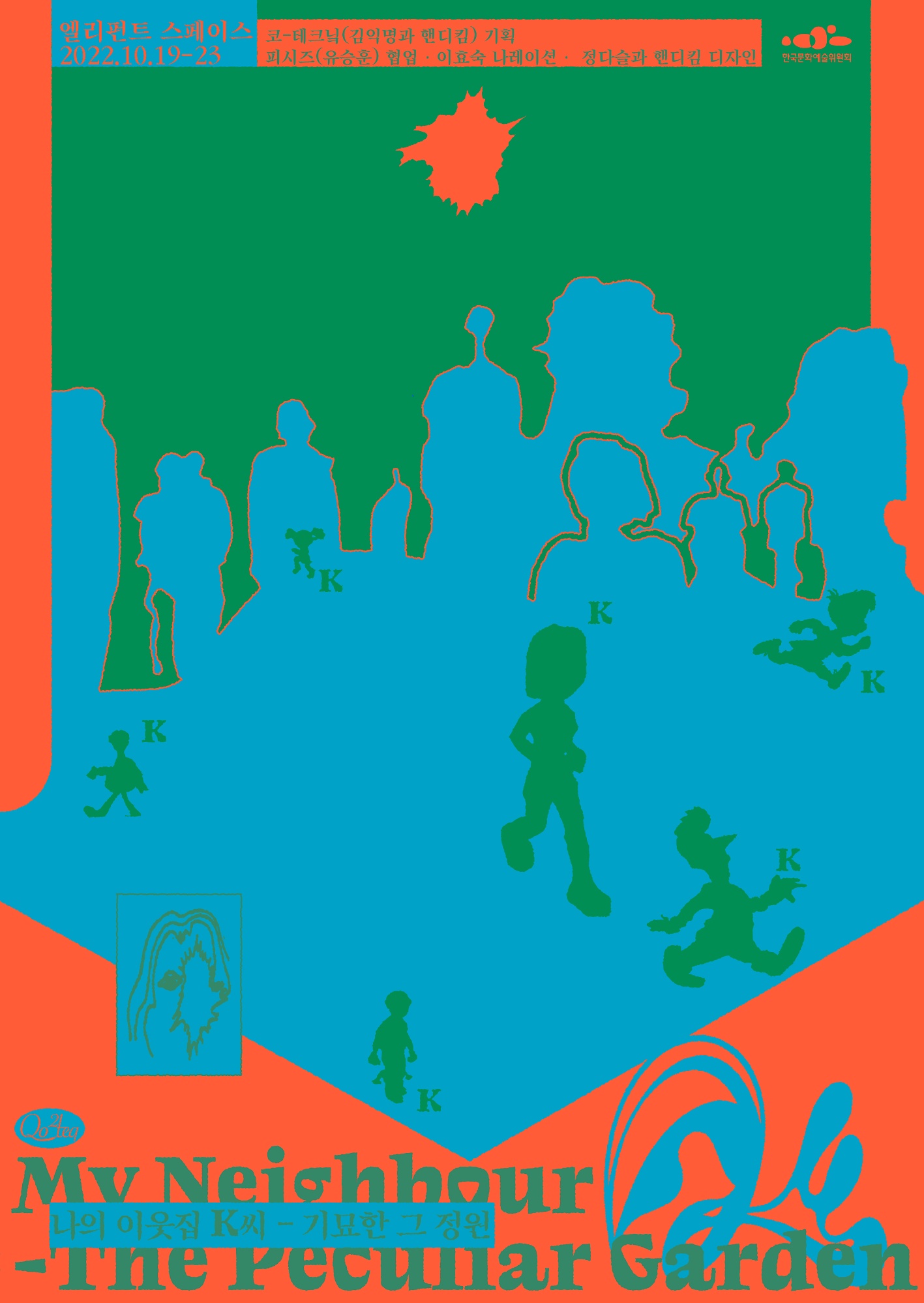김익명과 핸디킴은 세라믹으로 오브제를 만들고 땅의 모형을 제작하는 작가 피시즈(유승훈)와 협업하여 동시대의 풍경을 비트와 흙의 혼합으로 재현한다. 이 풍경은 여러 생명이 한곳에서 살아가는 '기묘한 정원'으로 묘사되는데, 땅 위에 기생하며 떠다니는 데이터를 캐릭터처럼 묘사하거나, 반대로 데이터에 의존하며 구성되는 땅을 보여줌으로써 비트와 흙 두 다른 현실의 근원적인 요소를 잇는다. 이러한 과정을 통해 ⟪나의 이웃집 K씨: 기묘한 그 정원⟫은 오늘날의 정보 기술 사회를 바라보고 이해하는 한 관점을 제안한다.