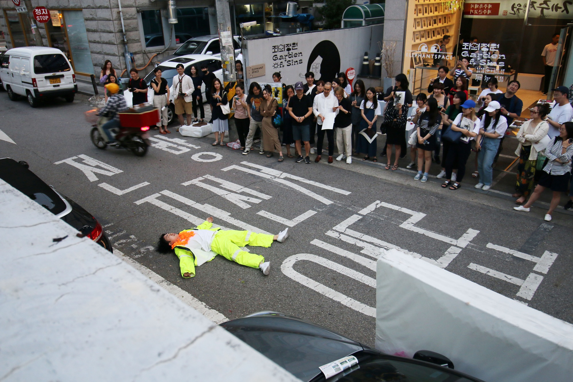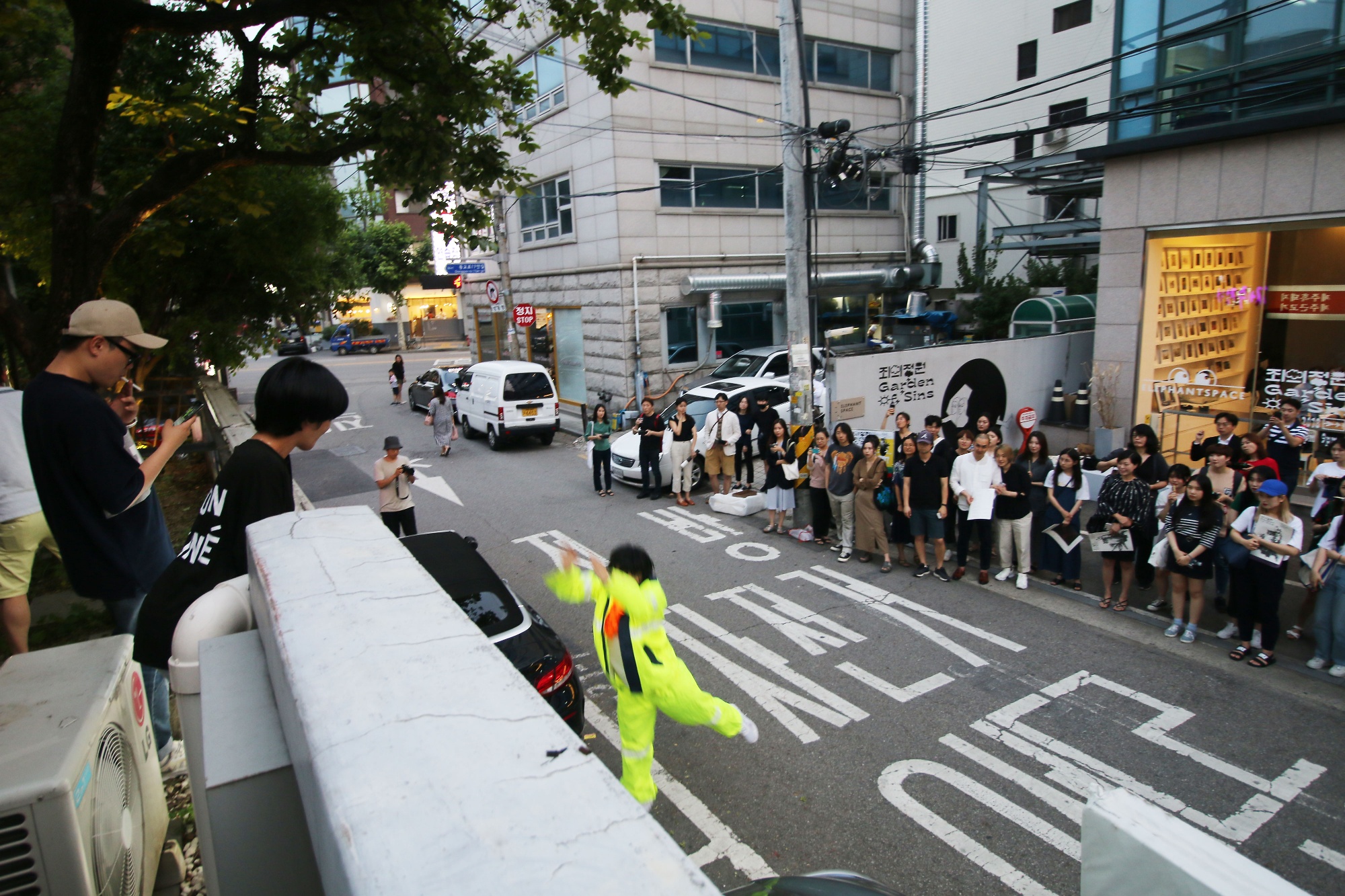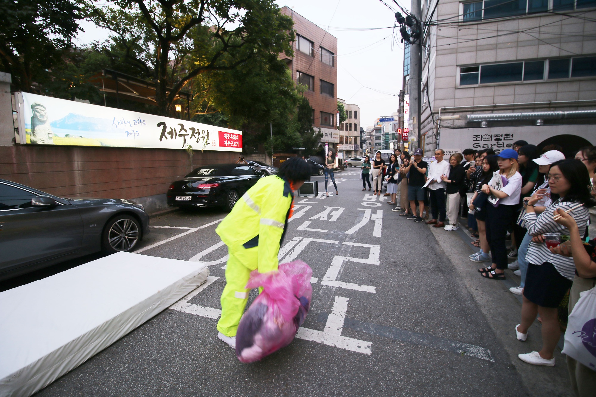 먼저 유한솔은 공간의 안과 밖을 차례로 돌아다니며 즉흥 퍼포먼스를 펼칩니다. 공간 앞 일방통행 도로는 그의 무대가 되었고, 그는 주변에 버려진 쓰레기를 소품으로 사용합니다. 또한, 그의 돌발행동으로 퍼포먼스를 구경하는 관람객은 예상치 못하게 그의 공연에 참여하게 됩니다. 이때 사람들의 반응과 표정이 인상적입니다. 다소 불쾌한 듯 인상을 찡그리는 길 위 행인과 그의 우스꽝스러운 동작에 웃음을 터뜨리는 관람객, 혹여 다치지 않을까 우려스러운 눈길로 쳐다보는 사람들도 있었습니다. 그의 즉흥적이고 다채로운 동작만큼 감상자의 반응도 가지각색이었습니다.