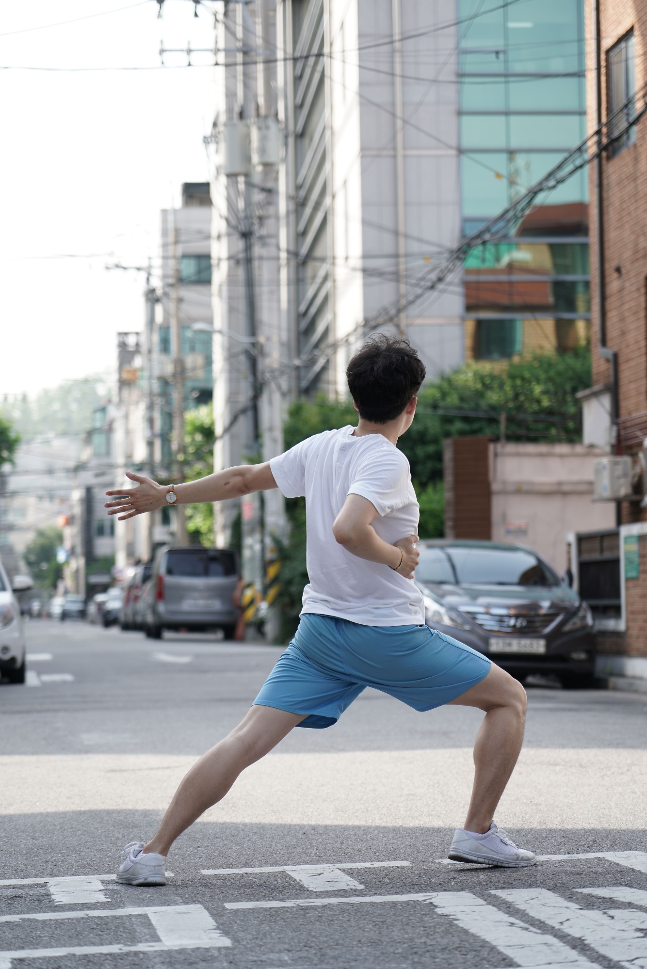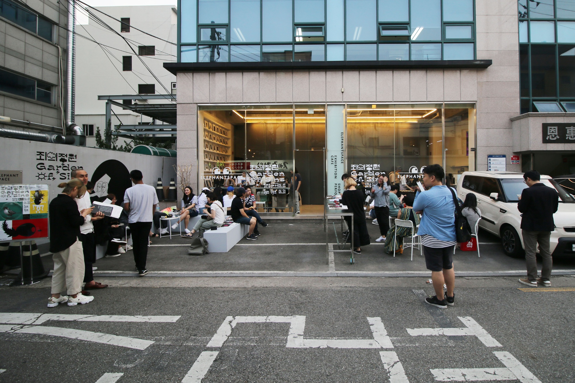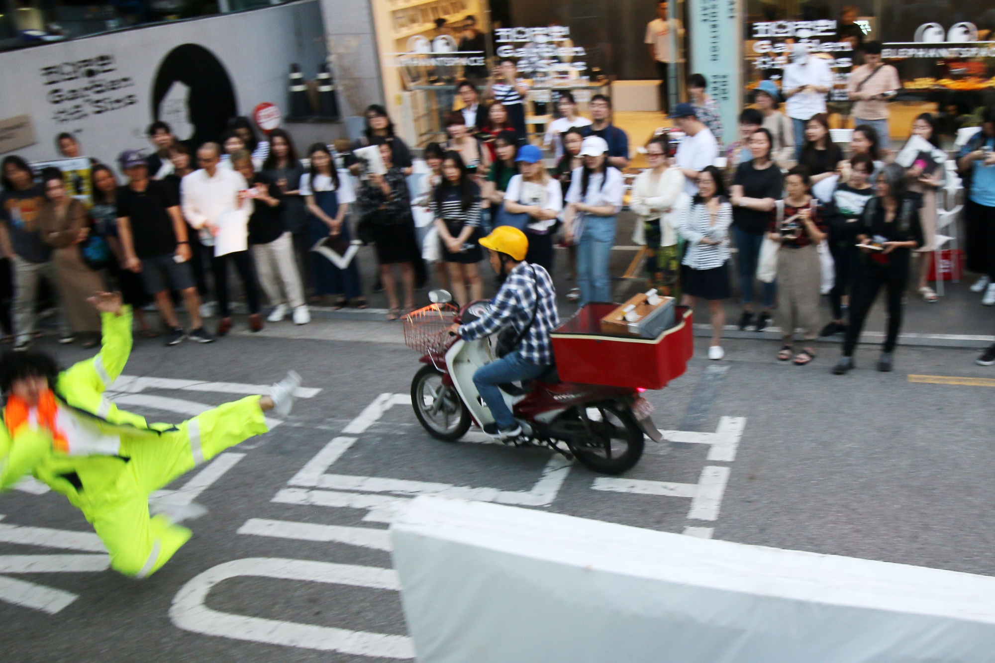먼저 유한솔은 공간의 안과 밖을 차례로 돌아다니며 즉흥 퍼포먼스를 펼칩니다. 공간 앞 일방통행 도로는 그의 무대가 되었고, 그는 주변에 버려진 쓰레기를 소품으로 사용합니다. 또한, 그의 돌발행동으로 퍼포먼스를 구경하는 관람객은 예상치 못하게 그의 공연에 참여하게 됩니다. 이때 사람들의 반응과 표정이 인상적입니다. 다소 불쾌한 듯 인상을 찡그리는 길 위 행인과 그의 우스꽝스러운 동작에 웃음을 터뜨리는 관람객, 혹여 다치지 않을까 우려스러운 눈길로 쳐다보는 사람들도 있었습니다. 그의 즉흥적이고 다채로운 동작만큼 감상자의 반응도 가지각색이었습니다.